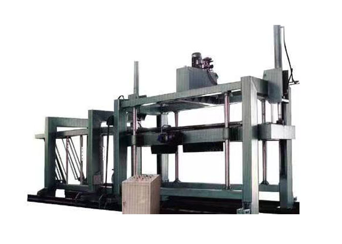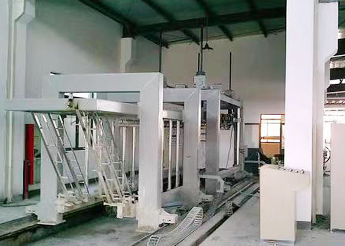 (2)坯體行走:預(yù)養(yǎng)好的坯體帶??罩蟹D(zhuǎn)90度,然后將坯體放在切割小車上或輥道上,由脫模機(jī)構(gòu)脫去???。坯體通過(guò)小車或輥道行走進(jìn)行水平切割,切割好后坯體繼續(xù)前行至橫切位置定位,進(jìn)行橫向切割,切割好后前行由行車吊走坯體。